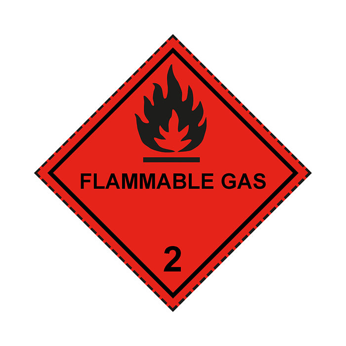 Gefahrzettel, Gefahrgutaufkleber Klasse 2.1 Entzündbare Gase mit Zusatztext Flammable Gas, Flamme Schwarz mit gestrichelter Kontrastlinie