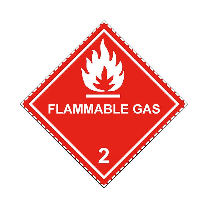 Gefahrzettel, Gefahrgutaufkleber Klasse 2.1 Entzündbare Gase mit Zusatztext Flammable Gas, Flamme Weiß mit gestrichelter Kontrastlinie