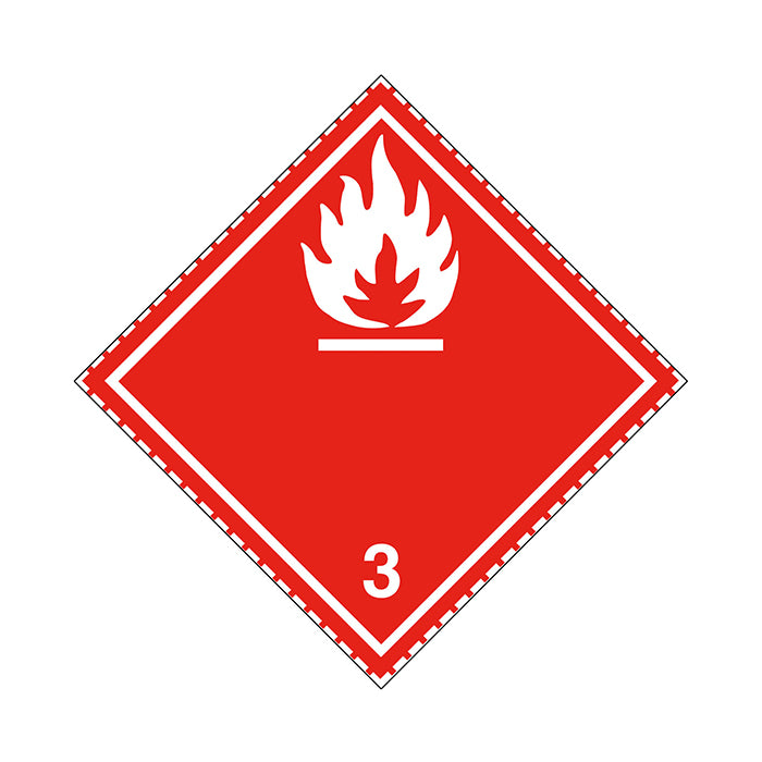 Gefahrzettel, Gefahrgutaufkleber Klasse 3 Entzündbare, flüssige Stoffe, Flamme Weiß mit gestrichelter Kontrastlinie