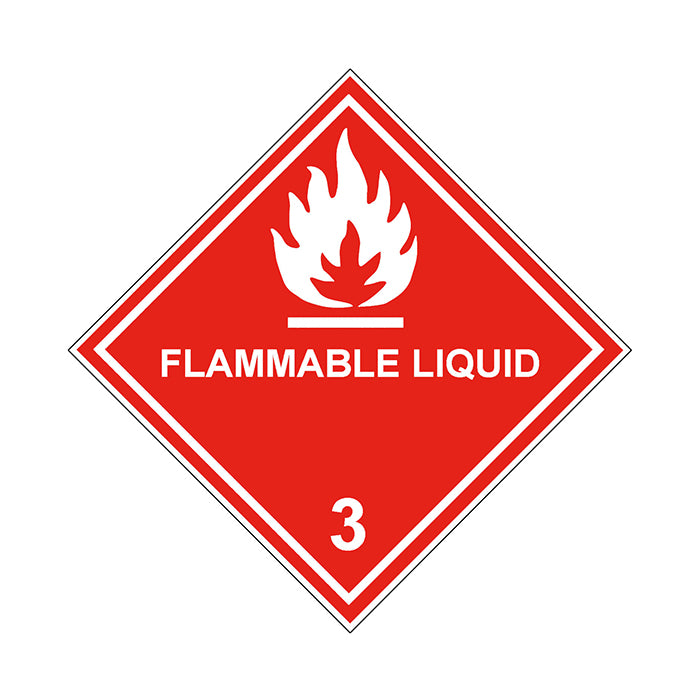 Gefahrzettel, Gefahrgutaufkleber Klasse 3 Entzündbare, flüssige Stoffe mit Zusatztext Flammable Liquid, Flamme Weiß mit durchgehender Kontrastlinie