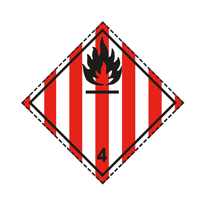 Gefahrzettel, Gefahrgutaufkleber Klasse 4.1 Entzündbare feste Stoffe, Flamme Schwarz mit gestrichelter Kontrastlinie