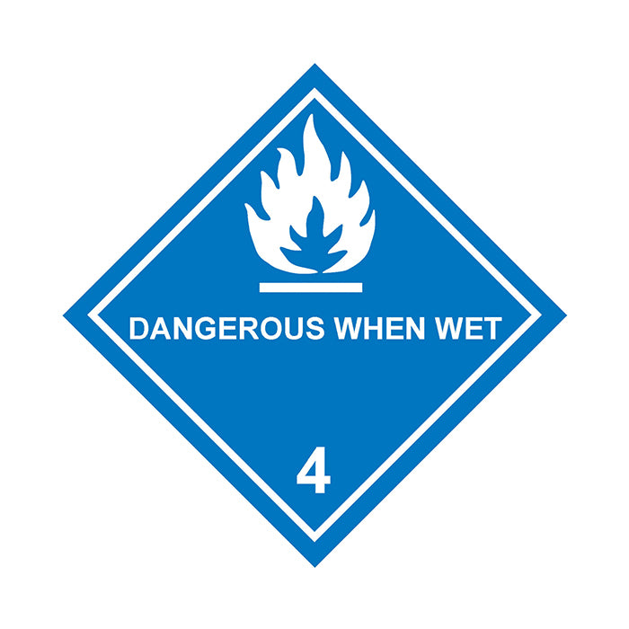 Gefahrzettel, Gefahrgutaufkleber Klasse 4.3 Stoffe, die mit Wasser entzündliche Gase bilden mit Zusatztext Dangerous When Wet, Flamme Weiß