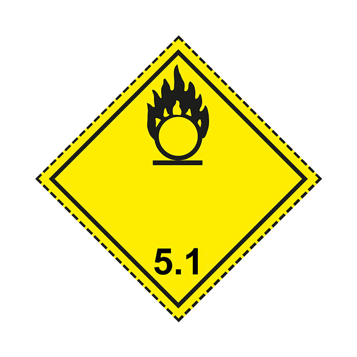 Gefahrzettel, Gefahrgutaufkleber Klasse 5.1 Entzündend (oxidierend) wirkende Stoffe, Flamme über einem Kreis Schwarz, mit gestrichelter Kontrastlinie