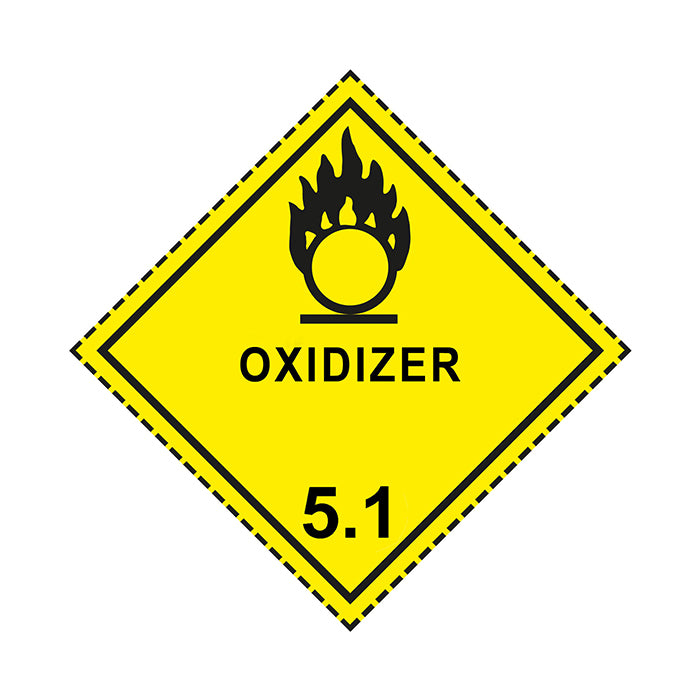 Gefahrzettel, Gefahrgutaufkleber Klasse 5.1 Entzündend (oxidierend) wirkende Stoffe, Flamme über einem Kreis Schwarz mit Zusatztext Oxidizer, mit gestrichelter Kontrastlinie