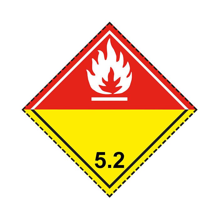 Gefahrzettel, Gefahrgutaufkleber Klasse 5.2 Organische Peroxide, Flamme Weiß, mit gestrichelter Kontrastlinie