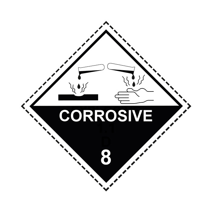 - Gefahrgutkennzeichnung ätzend mit gestrichelter Kontrastlinie mit Zusatztext CORROSIVE